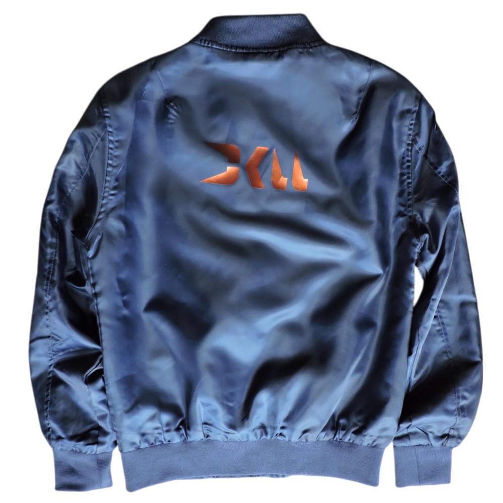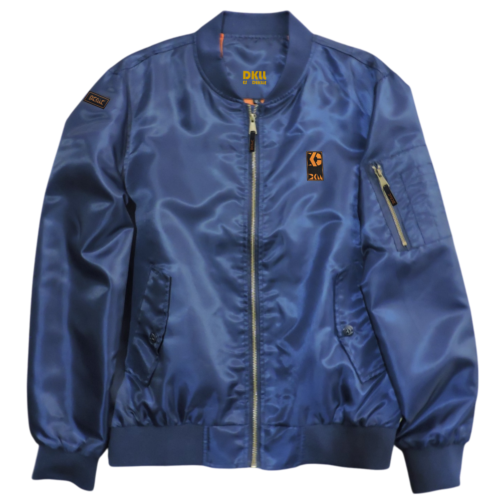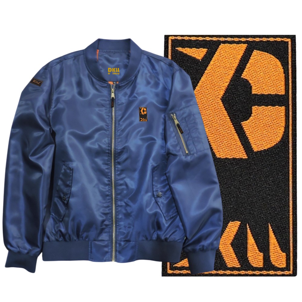 CHAQUETA UNISEX BOMBER AZUL NAVY, CON DISEÑO DE PARCHE MICROBORDADO BRONX EN PECHO, DISEÑO LOGO VINILADO DKLL BRONCE BRONX EN ESPALDA. TEJIDO RESISTENTE 100 % POLIÉSTER, CON FORRO INTERIOR SIN RELLENO. LA ETIQUETA MICROBORDADA DEKLLE PODRÁ IR EN CUALQUIERA DE LAS 2 MANGAS.