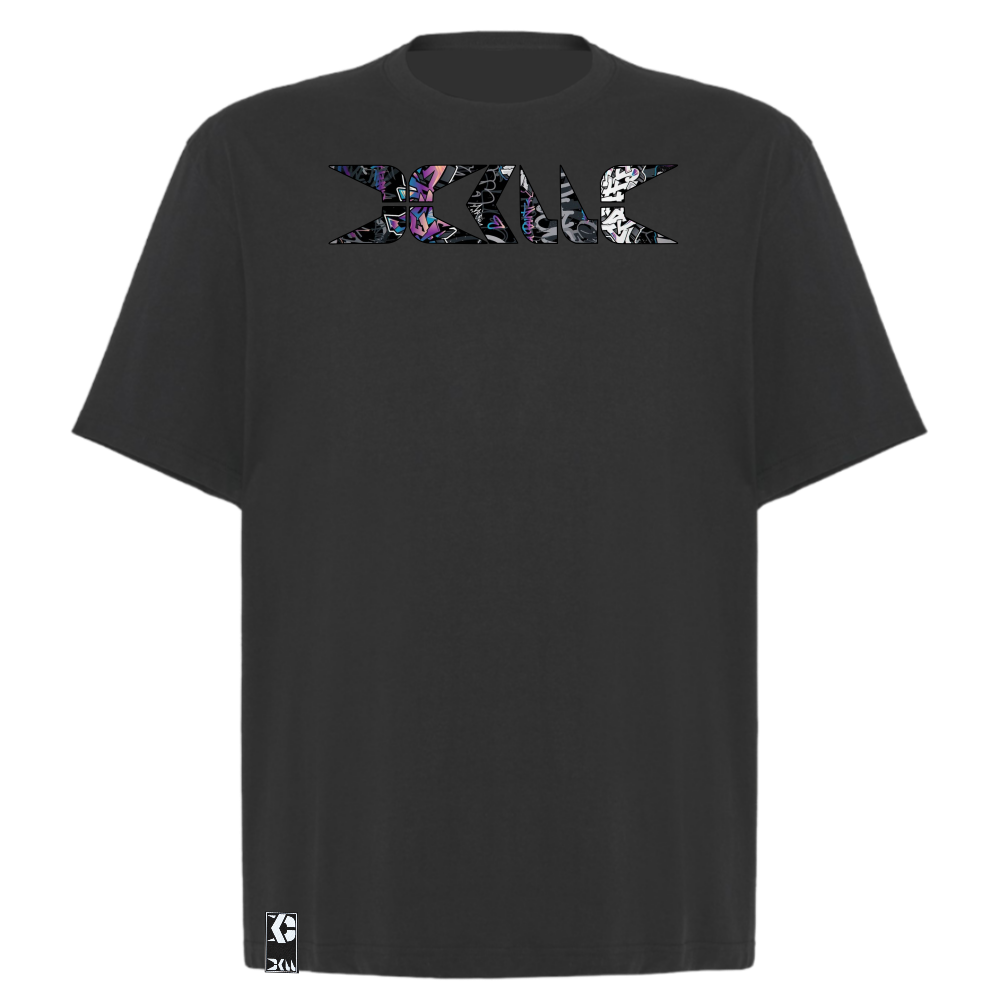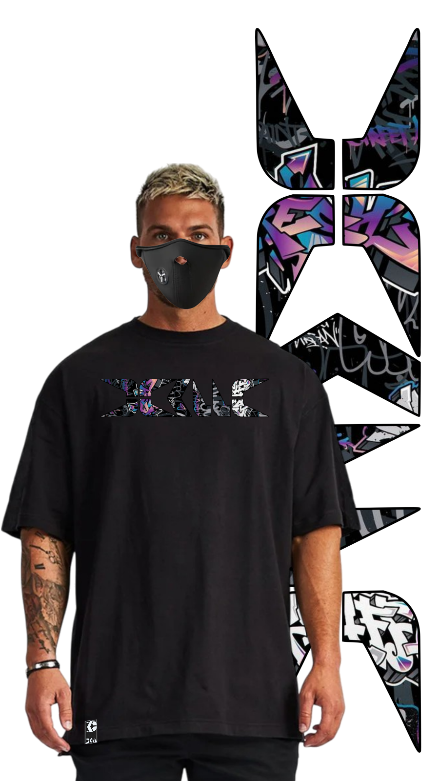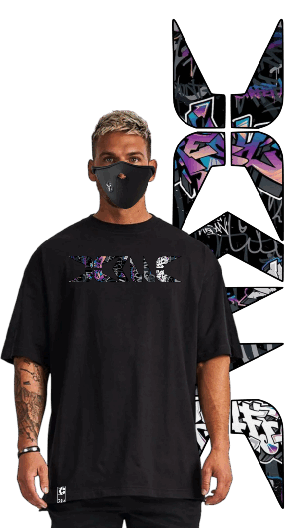 CAMISETA OVER NEGRA UNISEX, CON ESTAMPADO GRAFFITI EN PECHO Y ETIQUETAS EXTERIORES MICROBORDADAS, ESCLUSIVOS DE NUESTRA MARCA, UN TEJIDO ESPECIAL DE ALGODÓN, CON UN GRAMAJE PERFECTO PARA TODO EL AÑO.