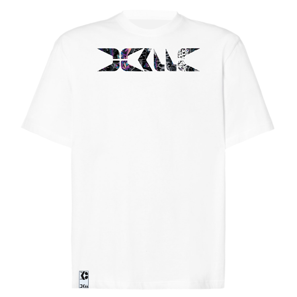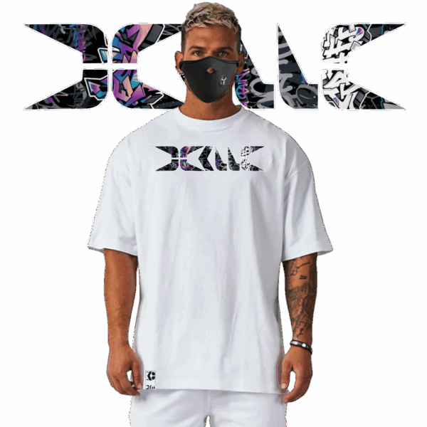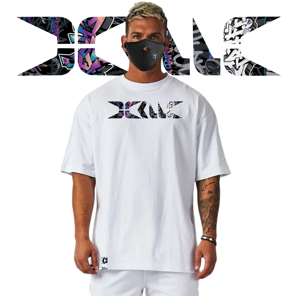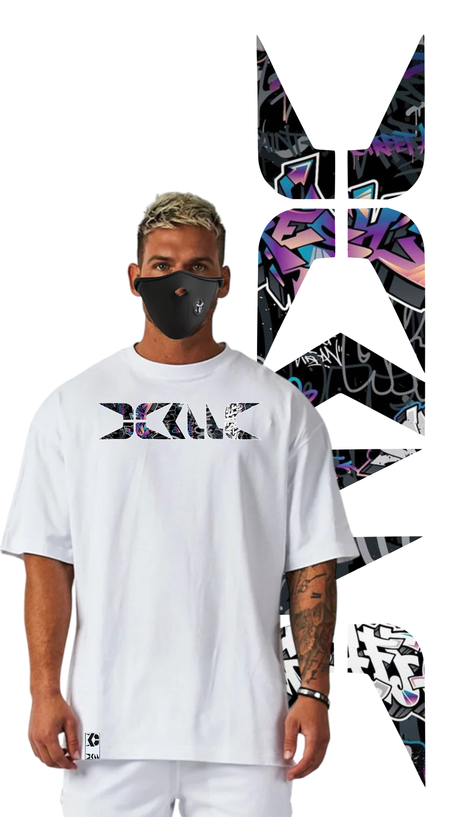 CAMISETA OVER BLANCA UNISEX, CON ESTAMPADO GRAFFITI EN PECHO Y ETIQUETAS EXTERIORES MICROBORDADAS, ESCLUSIVOS DE NUESTRA MARCA, UN TEJIDO ESPECIAL DE ALGODÓN, CON UN GRAMAJE PERFECTO PARA TODO EL AÑO.