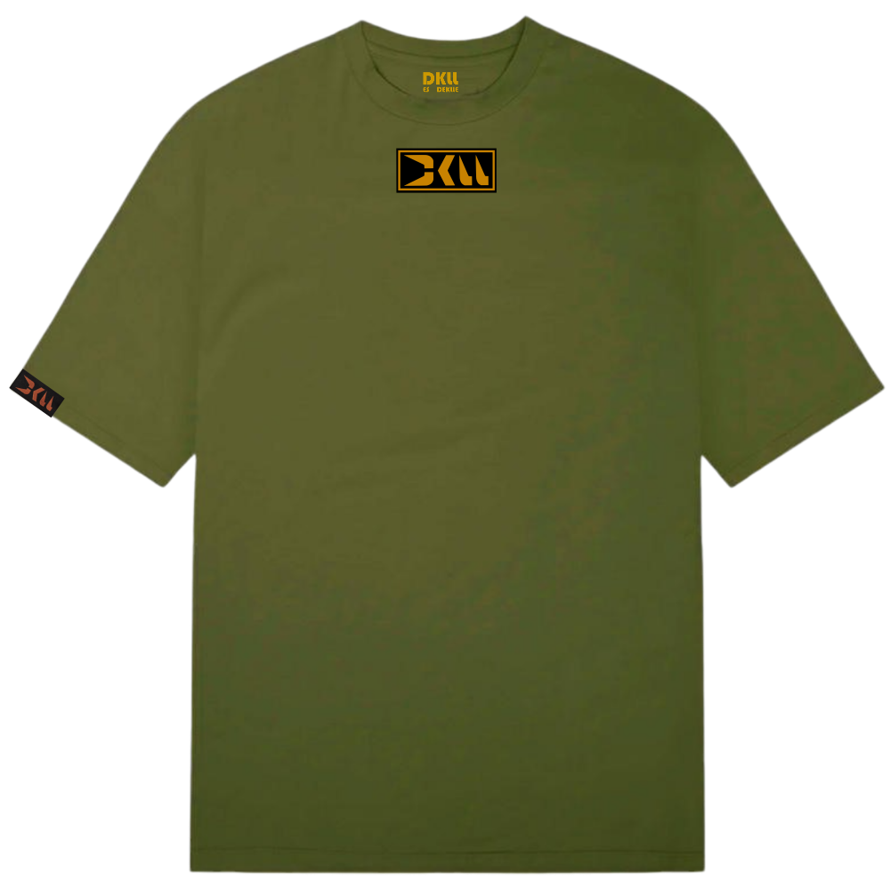 CAMISETA VERDE ARMY TEJIDO FIT PRO, DISEÑO DKLL MICROBORDADO EN PECHO, ETIQUETA TEJIDA EN MANGA.