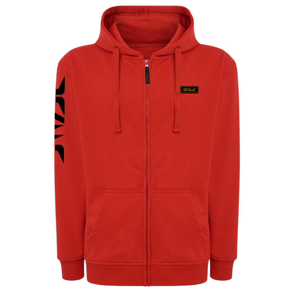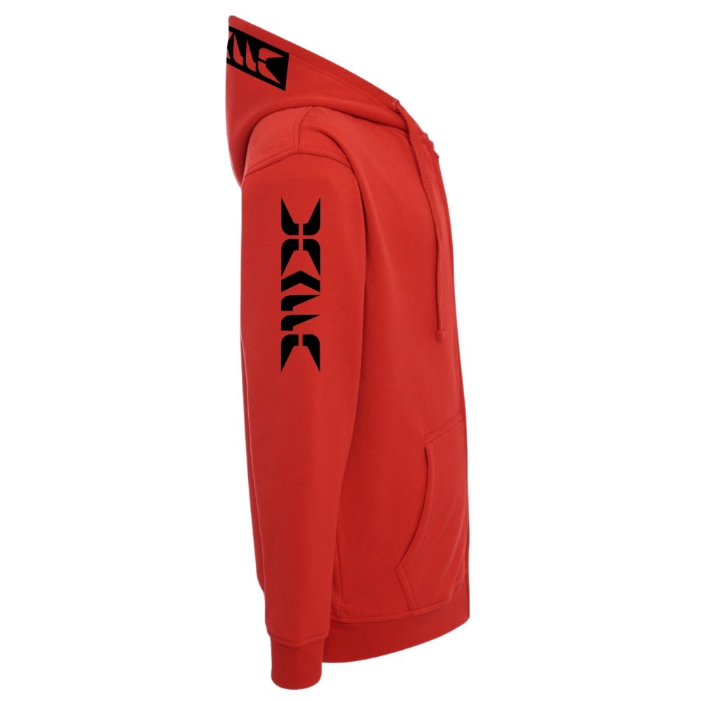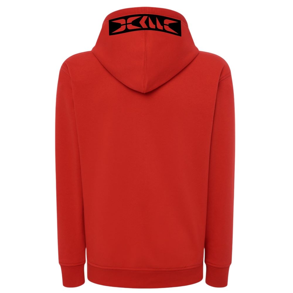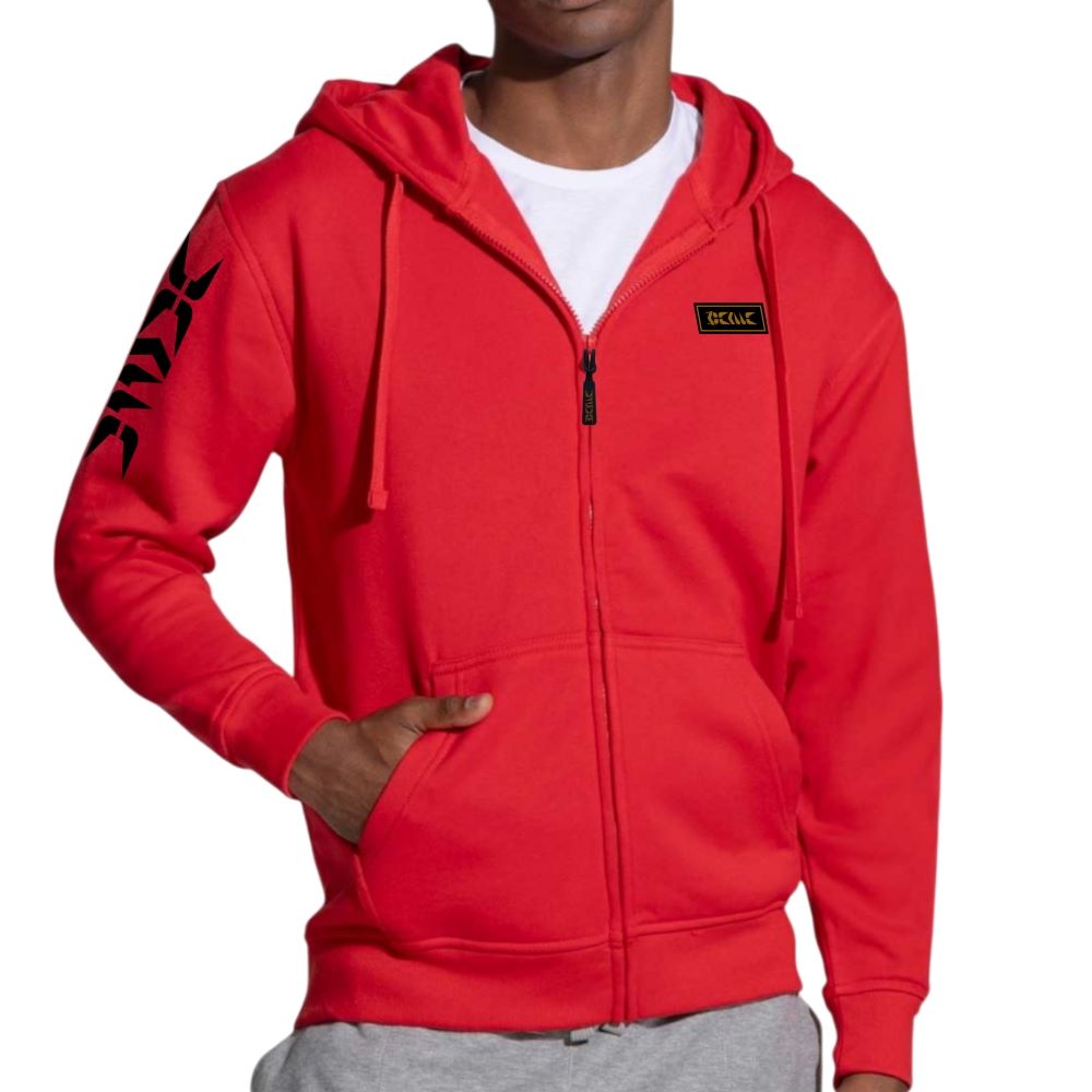 SUDADERA UNISEX CON CREMALLERA Y CAPUCHA, COLOR ROJA, LOGO PECHO TERMO BORDADO, DISEÑO DEKLLE EN MANGA ENGOMADO 3D. CALIDAD SUPREM, 80 % ALGODÓN 20 % POLIÉSTER. TALLAS XXS Y XXXS SIN CORDON.